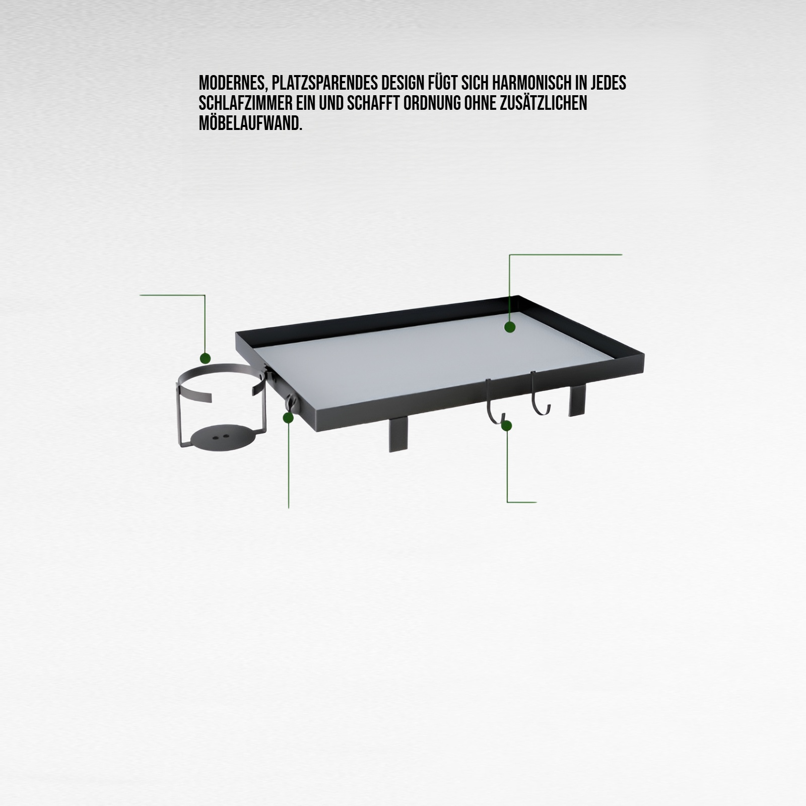 ● Praktischer Bett-Side Organizer mit stabilem Clip, ermöglicht eine bohrfreie und schnelle Montage an Bettgestellen, ideal für Mietwohnungen und empfindliche Oberflächen. ● Vielseitige Ablage bietet ausreichend Platz für Ihr Smartphone, Bücher, Brille und kleine Alltagsgegenstände – alles griffbereit direkt am Bett. ● Der integrierte Telefonhalter schützt Ihr Gerät vor dem Herunterfallen und sorgt für eine sichere Aufbewahrung während des Schlafs oder beim Entspannen. ● Modernes, platzsparendes Design fügt sich harmonisch in jedes Schlafzimmer ein und schafft Ordnung ohne zusätzlichen Möbelaufwand. ● Hochwertige Materialien garantieren Langlebigkeit und eine einfache Reinigung – perfekt für den täglichen Gebrauch und ein aufgeräumtes Wohngefühl.